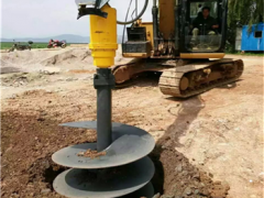 本公司生产的螺旋钻机是安装在挖掘机、装载机的一种新型高效成孔作业的施工机械,安装简单,携带方便,操作容易,型号齐全,适合安装于大中小型轮式、链式挖掘机及装载机,螺旋钻机是一种适合建筑基础工程中快速成孔作业的施工机械, 适用于土层、黏土层、填土层、粘土层、粉土层、淤泥层、沙土层及部分含有卵石的地层用于电力、电信、市政、高铁、高速、公路、建筑、石油、林木等各种土质层上面的柱杆、木桩、桥墩、林木等钻孔工程,实现多功能特点。其施工效率高,是电力、通信、市政、高铁、高速、公路、建筑、石油、林木等理想的基础施工设备。高铁接触网支架桩、护坡桩,太阳能光伏电站地基支架桩,电网改造、民用建筑、新农村建设、市政工程建设、园林绿化等多种工程项目。